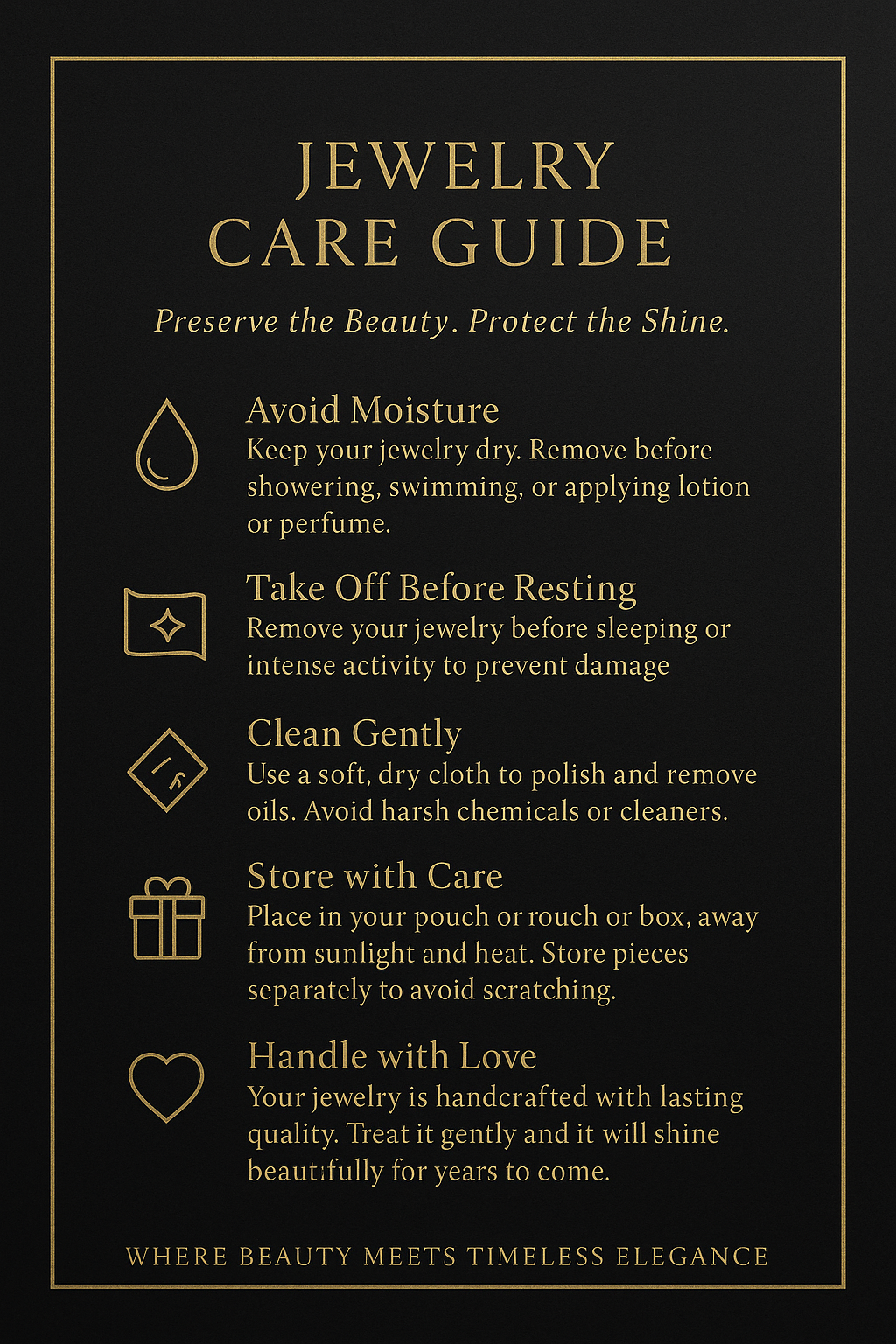 Care: Store separately, gently polish with a soft cloth, and avoid harsh chemicals to preserve brilliance and finish.
